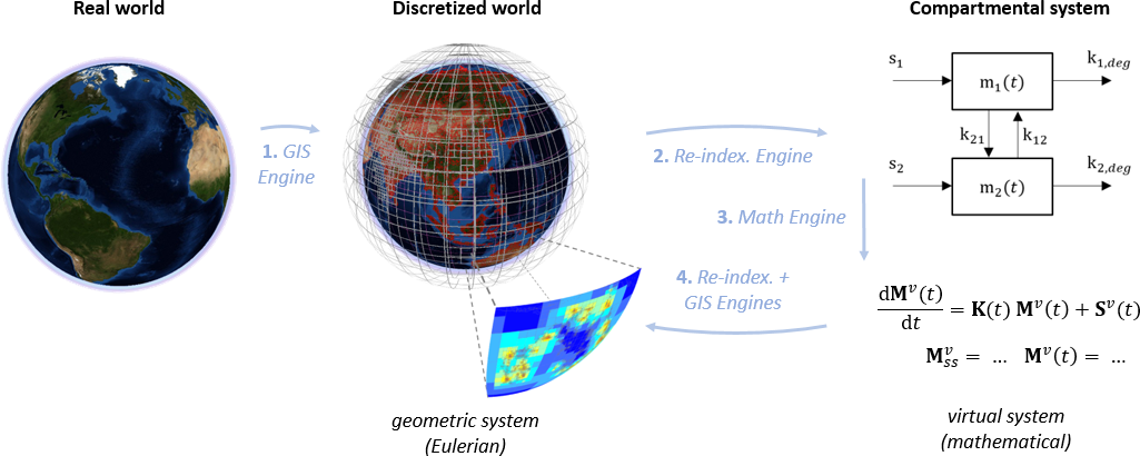 The general flow of operations in Pangea is represented in Fig.1. We start with non-gridded geo-referenced data that characterize the natural system (loosely defined as "the world"). Using its GIS engine [1] and a set of Environmental Models (EMs), Pangea builds a set of grids that cover all relevant media, hence defining the geometrical system, and projects geo-referenced data in this system. Gridded data and geometric and topological parameters are then re-indexed [2] into what we call the virtual system which, in short, is a common indexing schema where all grids and media receive a specific indexing space. Using re-indexed data/parameters and a set of Environmental Processes Models (EPMs), Pangea builds a mathematical compartmental system. This system is solved [3] (for e.g. environmental concentrations at steady-state), further computations are performed (e.g. population exposure), and the solution is re-indexed backward to relevant grids [4] for analysis and visualization.